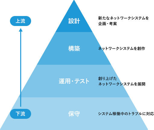 ITインフラに事業を専門特化しているからこそ、インフラエンジニアとして運用・保守(下流工程)から構築・設計(上流工程)まで全ての工程に携わることができる。