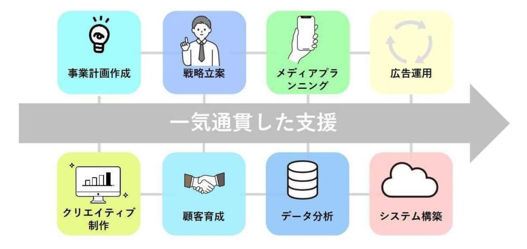『無数の新しい価値で、多数の世界一を』というVisionを掲げ、サブスクリプションモデルの通販企業を主なクライアントとして、ダイレクトマーケティング支援をしており、「D2C×サブスク領域のデジタルマーケティング支援」において、リーディングカンパニーの地位を築き上げている。