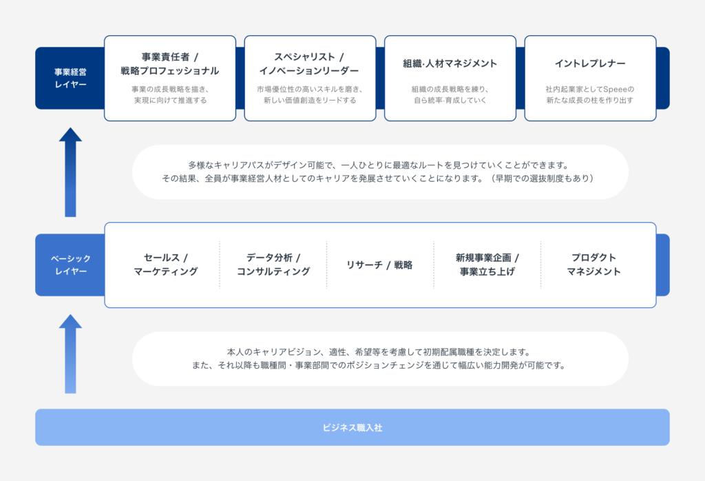 スピード感はもちろんのこと、多角事業×多職種存在するからこそ、入口の職種もその後のキャリアパスも幅広い選択肢がある。